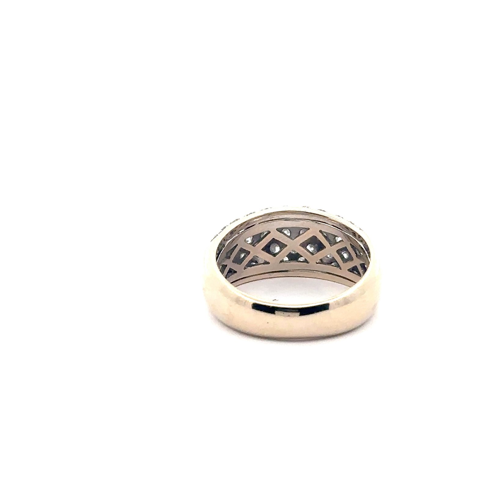 Impactante anillo realizado en oro blanco macizo, una pieza de gran presencia y sofisticación, engastada con 103 brillantes naturales que totalizan aproximadamente 1.88 quilates. Su diseño tipo pavé crea una superficie completamente cubierta de diamantes que reflejan la luz desde todos los ángulos, generando un brillo extraordinario y una vida única en la pieza. Los brillantes, de excelente calidad y pureza, ofrecen un destello intenso y elegante que convierte a este anillo en una joya verdaderamente excepcional. Las piezas realizadas en oro blanco macizo son cada vez más buscadas por su elegancia moderna y su versatilidad, siendo ideales tanto para uso diario como para ocasiones especiales. Con un peso de 12 gramos, el anillo posee una estructura sólida que transmite lujo, calidad y presencia en la mano.