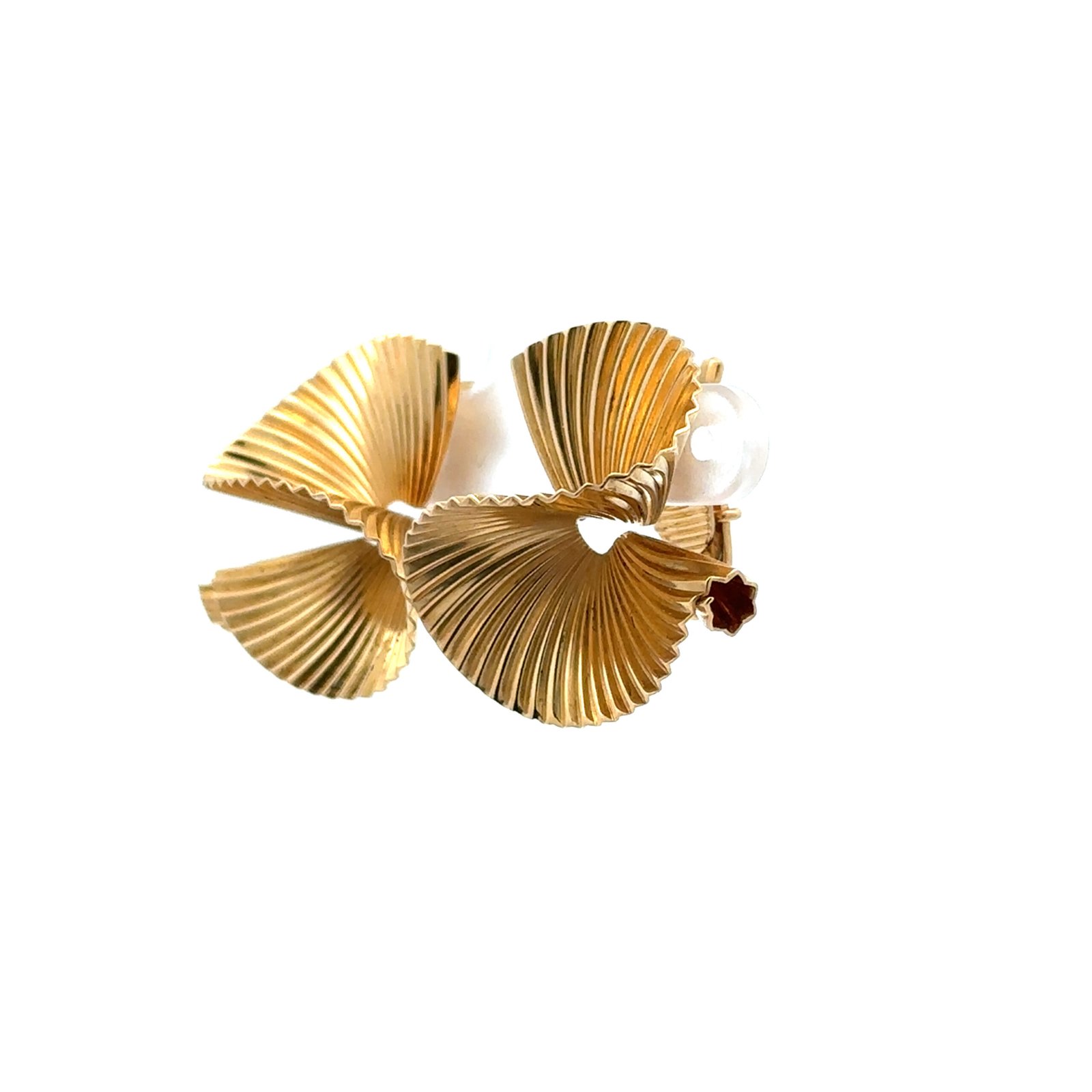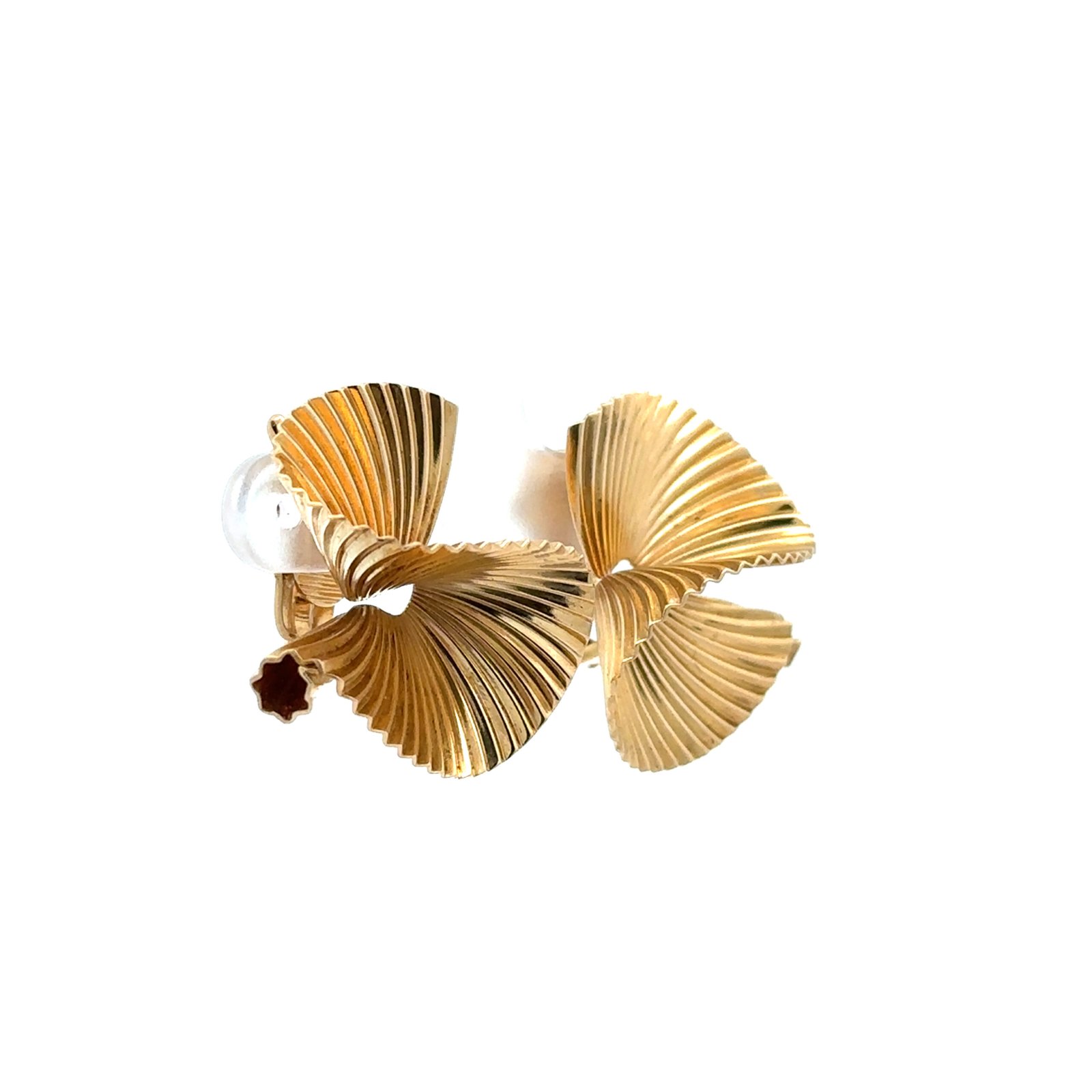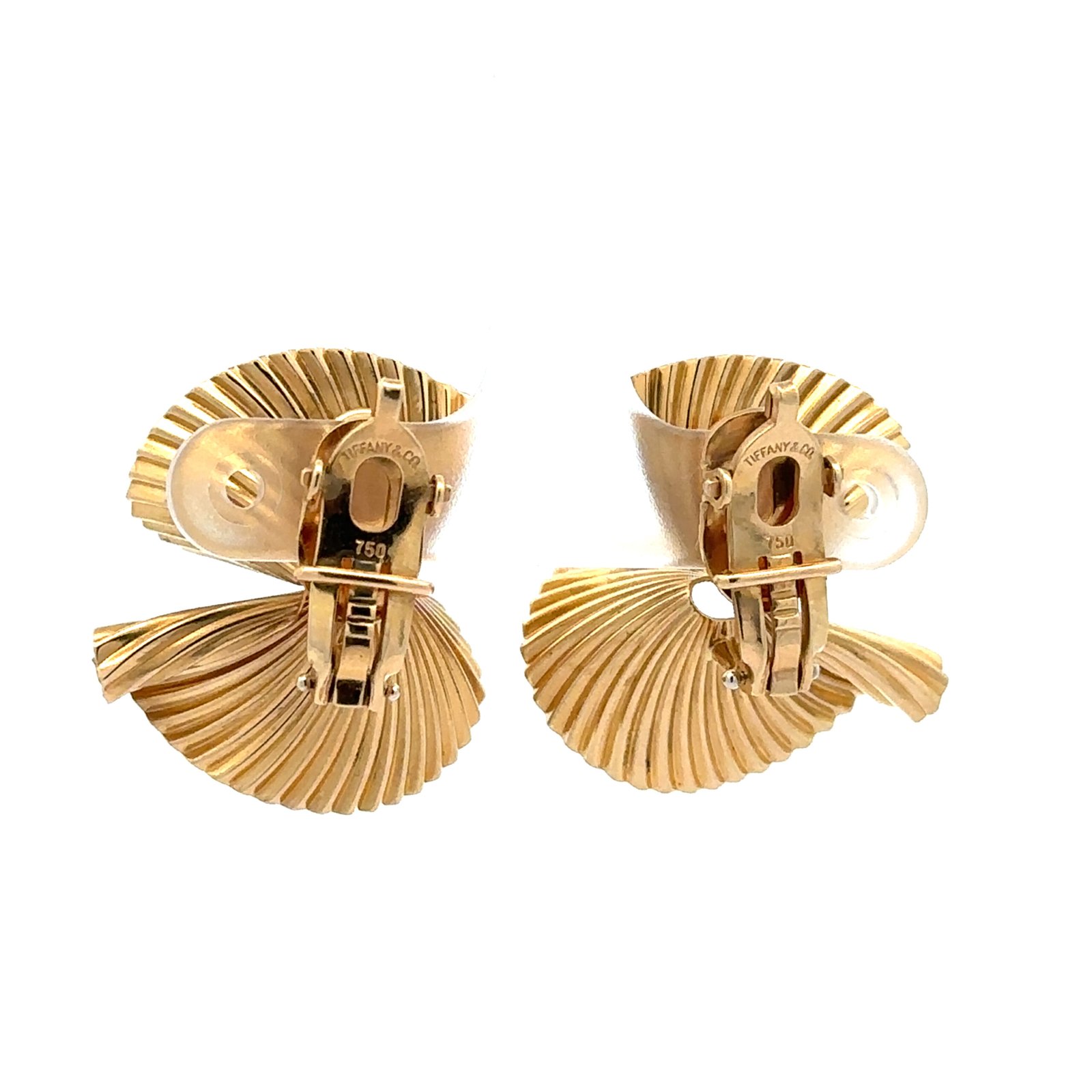 Elegantes aros vintage Tiffany & Co., modelo “Swirl”, realizados en oro amarillo de 18 quilates, con un distintivo diseño de volutas estriadas que generan un efecto de movimiento y reflejo de luz excepcional. Pieza original de alta joyería de época, datable en finales de los años 70 / década de 1980, con cierre clip característico de Tiffany en sus creaciones más sofisticadas. Un diseño icónico, atemporal y refinado, representativo del estilo escultórico de la casa, ideal tanto para uso elegante diario como para ocasiones especiales. Peso total: 14,6 gramos. Medidas: 2,6 x 2,5 cm